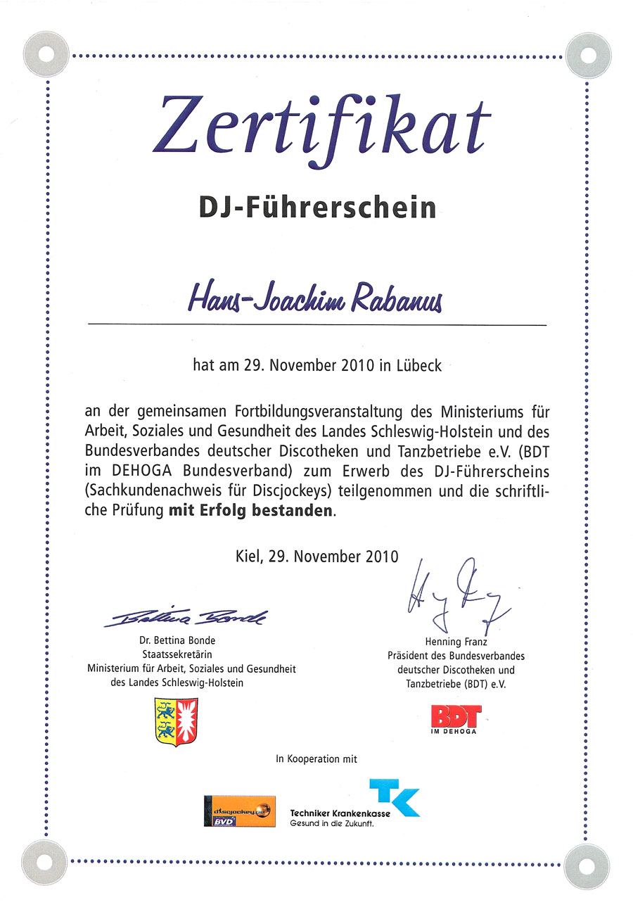 Die Discothekenunternehmer in Deutschland haben bereits angekündigt, dass sie zukünftig nur noch DJs beschäftigen werden, die ihre fachliche Qualifikation im Umgang mit der Musiklautstärke durch den erworbenen DJ-Führerschein nachweisen können. Denn die Unternehmer sehen sich einer steigenden Anzahl von Schmerzensgeldklagen von gehörgeschädigten Gästen ausgesetzt.